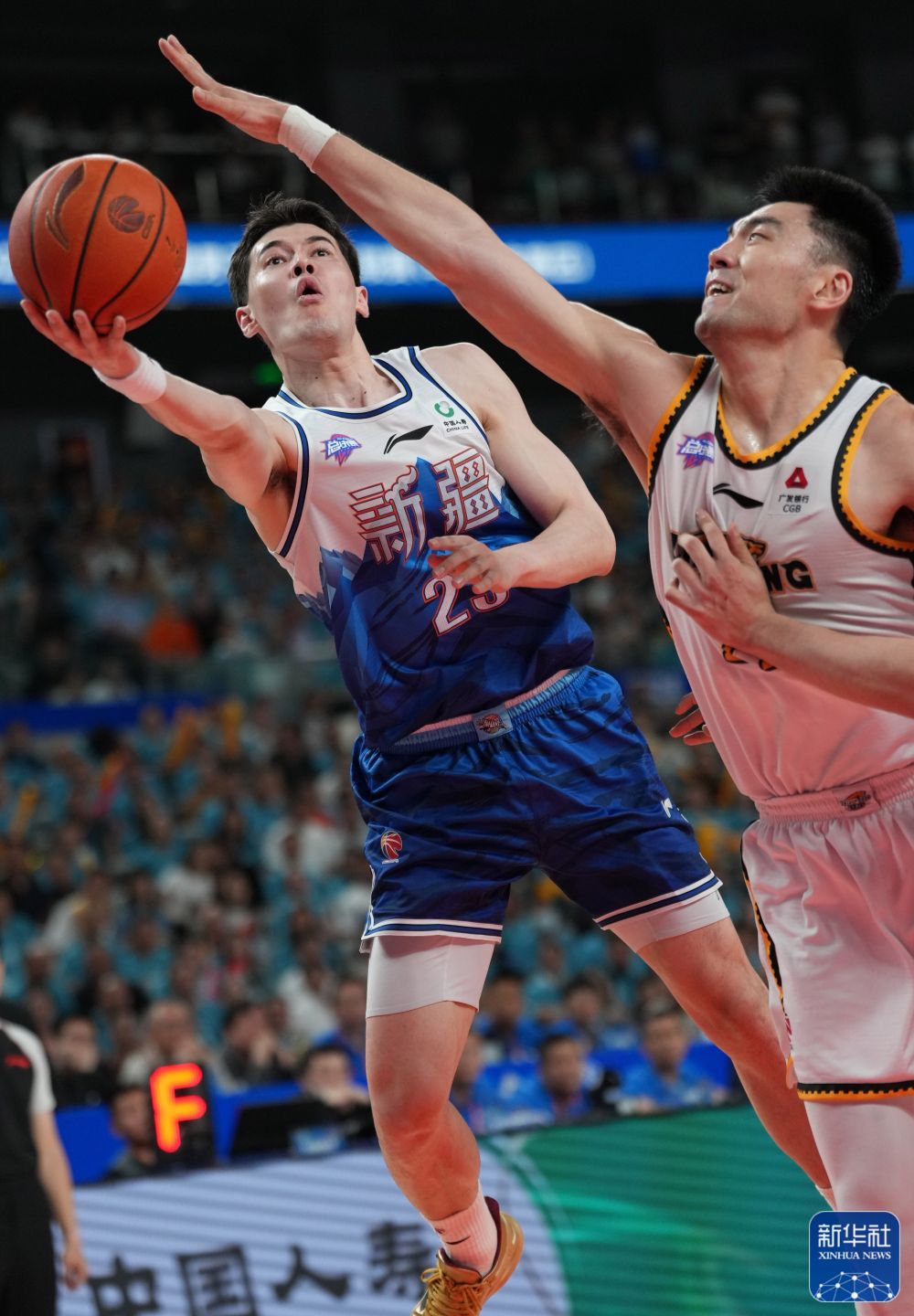 ↑新疆伊力特队球员阿不都沙拉木(左)在比赛中突破上篮。新华社记者 孟永民 摄