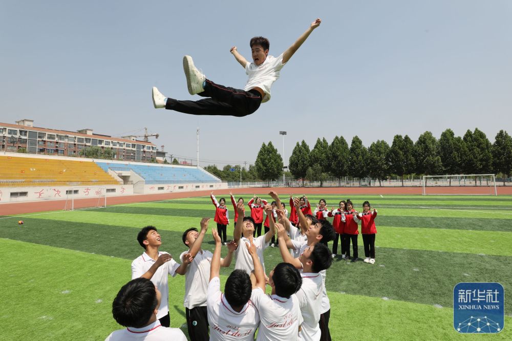 5月22日,河北省遵化市东新庄镇东梁子河中学高三学生在做游戏。
