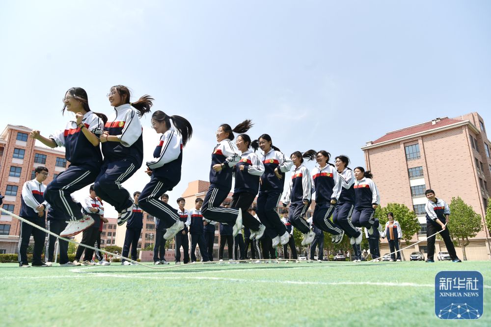 5月22日,山东潍坊高密市第五中学高三学生在跳长绳。新华社发(李海涛摄)