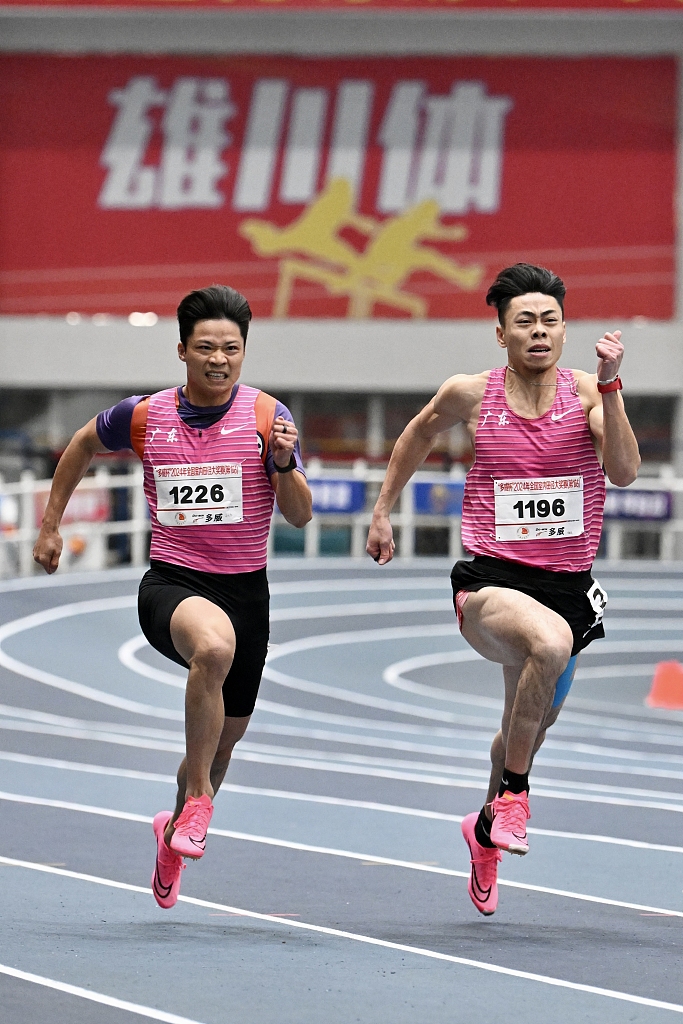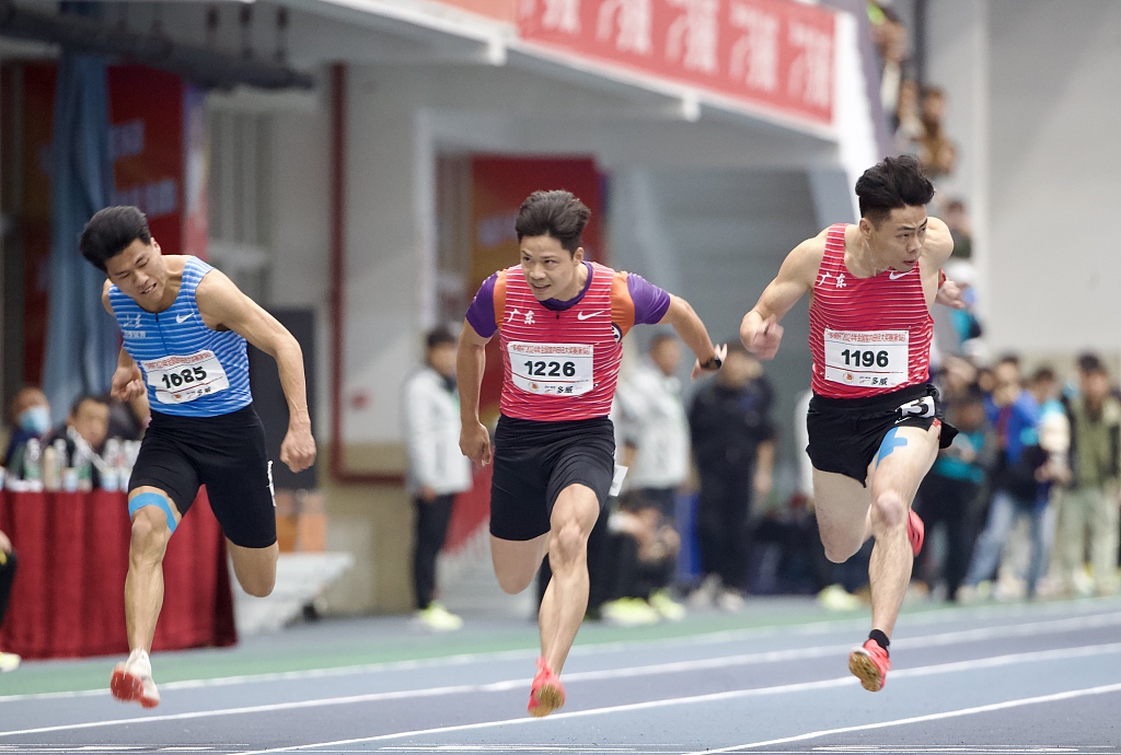 苏炳添(左)在室内赛比赛中。