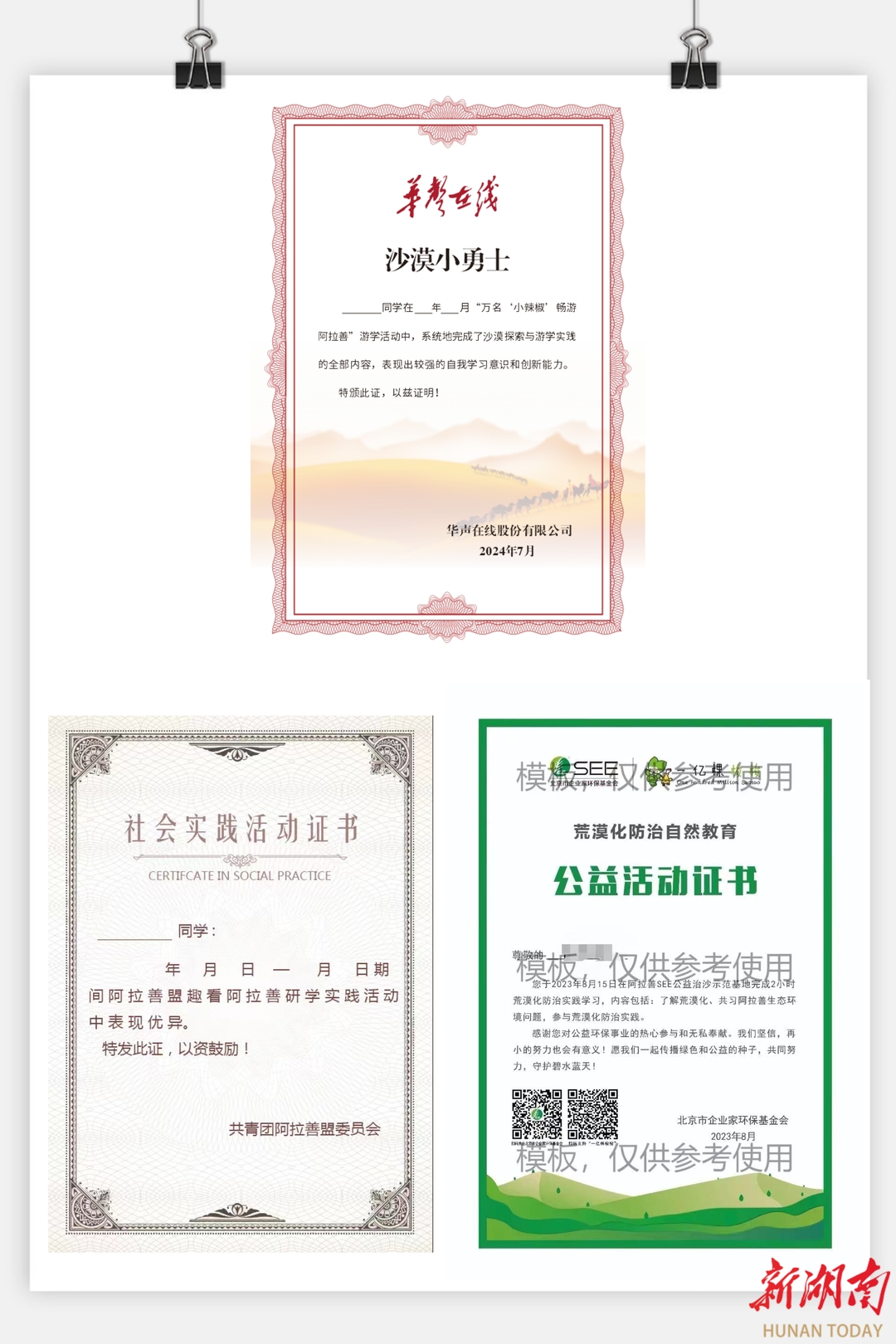 当然,这么难得的活动,留下精美的证书是必须的——除了共青团阿拉善盟印发的《社会实践活动证书》,还有华声在线颁发的《沙漠小勇士》证书,以及荒漠化防治自然教育《公益活动证书》。此外,还有印制有阿拉善风景名胜的明信片。
