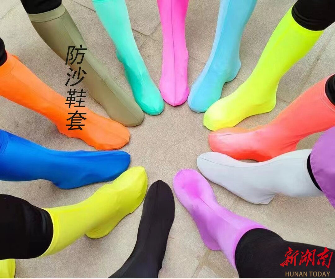 记者看到,防沙帽则选用了带点酷又带点潮的冷色调,圆边可以防晒;防沙鞋套则七彩缤纷,将贴心保护小朋友们的双脚。
