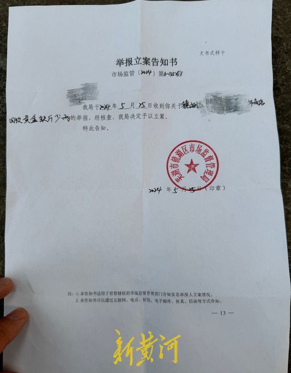 根据《举报立案告知书》,芜湖市镜湖区市场监督管理局于5月25日,“收到你对关于镜湖区某黄金珠宝商回收黄金缺斤少两的举报,经核查,我局决定予以立案。”落款日期为2024年5月25日。