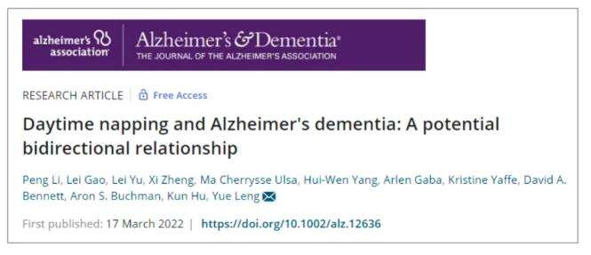 2022年一项刊发在《阿尔茨海默氏症与痴呆症》杂志的研究发现,午睡和大脑衰老之间存在双向关系。白天过度午睡会增加晚年患阿尔茨海默病的风险。与此同时,随着患者年龄的增长,患有阿尔茨海默病会导致白天午睡增加。