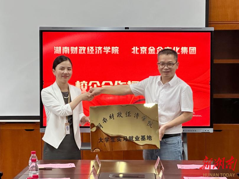 授牌仪式上,人文与艺术学院党委书记何四海为北京金企文化集团有限公司授“湖南财政经济学院大学生实习就业基地”牌匾。校企双方围绕就业岗位、人才需求、校企合作等方面进行了交流。