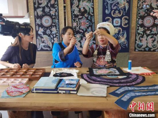 5月21日,台湾《大陆寻奇》摄制组在贵州省三都水族自治县拍摄马尾绣的制作。张红艳 摄