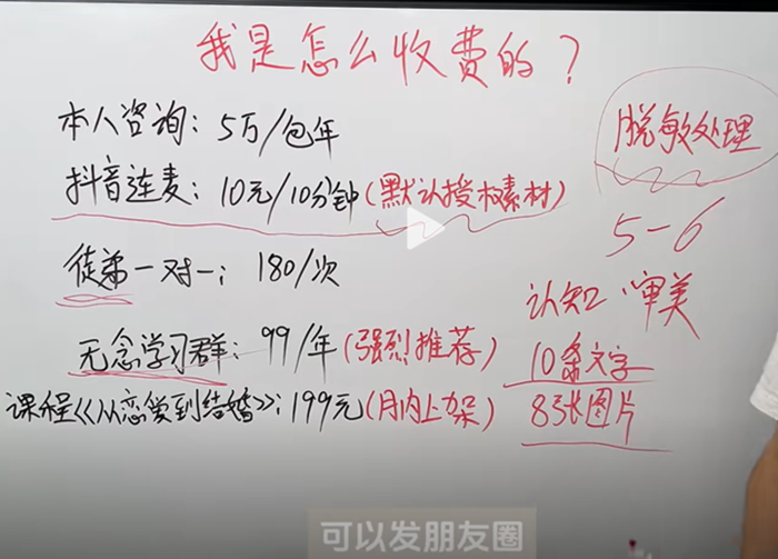 此外,不少婚恋军师都公开了联系方式,通过提供一对一指导、付费视频、情感课程、收徒、经营朋友圈教学等形式敛金,且价格不菲。