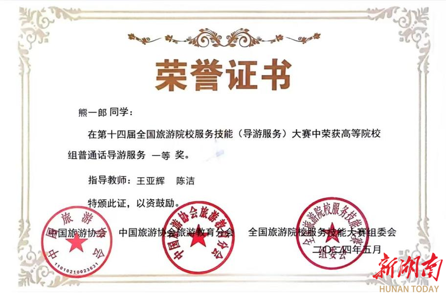据了解,熊一郎自入校以来,积极参与专业技能竞赛,曾获得第十三届全国大学生红色旅游创意策划大赛全国特等奖和个人最佳风采奖,创学校参加该项赛事以来最好成绩。