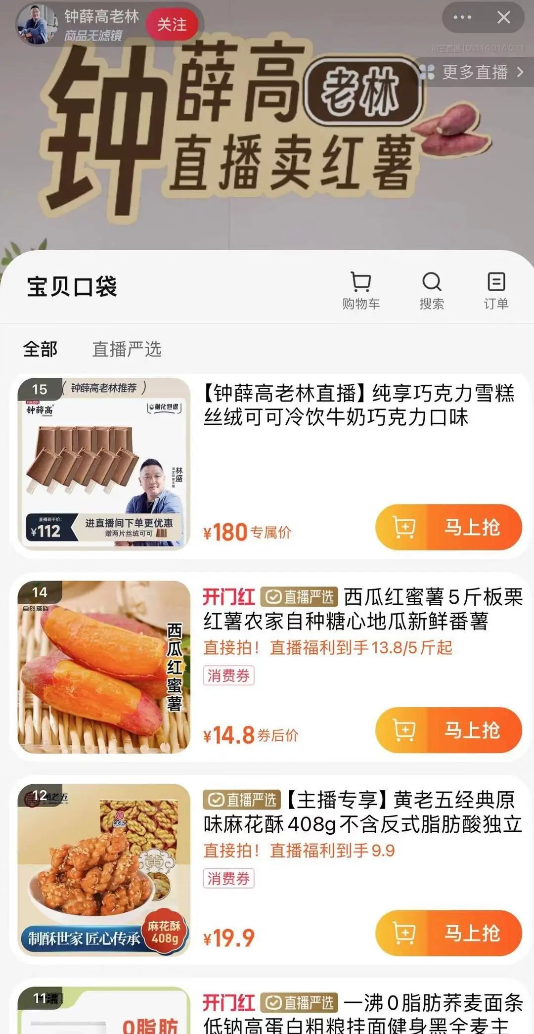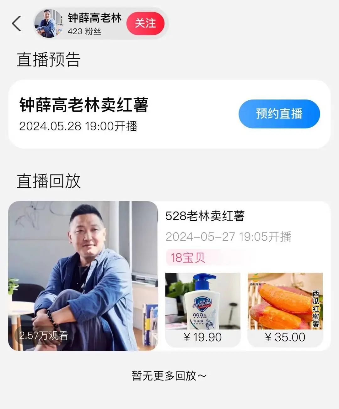 记者注意到,直播间背景有“钟薛高老林直播卖红薯”字样,林盛并未现身5月27日的直播间。直播间主播表示,5月27日仅为预告,林盛将于5月28日19点正式开始直播卖货。根据目前已放出的上架产品信息,该直播间将售卖钟薛高多款雪糕产品,一只雪糕平均价格在4到6元左右。除此外,还有红薯、茶叶等农产品以及瓜子、麻花等休闲零食,甚至还有洗手液等用品。