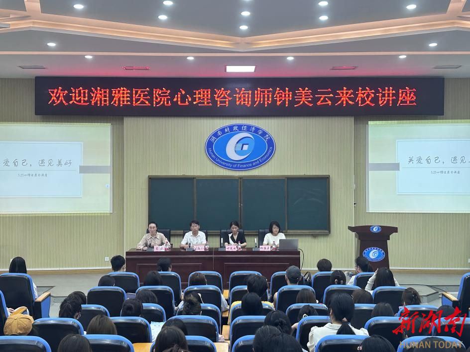 5月25日,湖南财政经济学院会计学院邀请中南大学湘雅医学院心理咨询师钟美云在二教学楼2J02学术报告厅开展“关爱自己,遇见美好”专题讲座。讲座由院党委副书记肖芳主持,院党委书记戴恩湘、全体辅导员,学生工作处相关老师及近180名学生一同聆听了讲座。