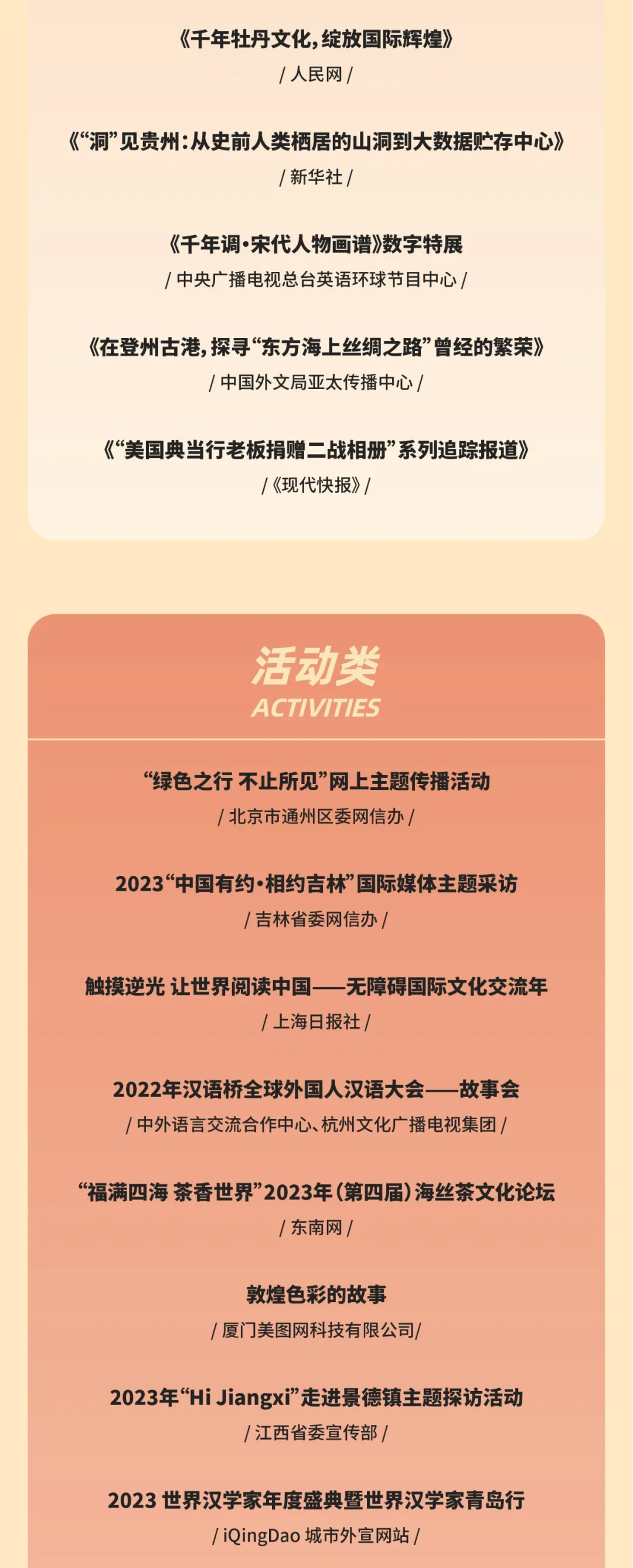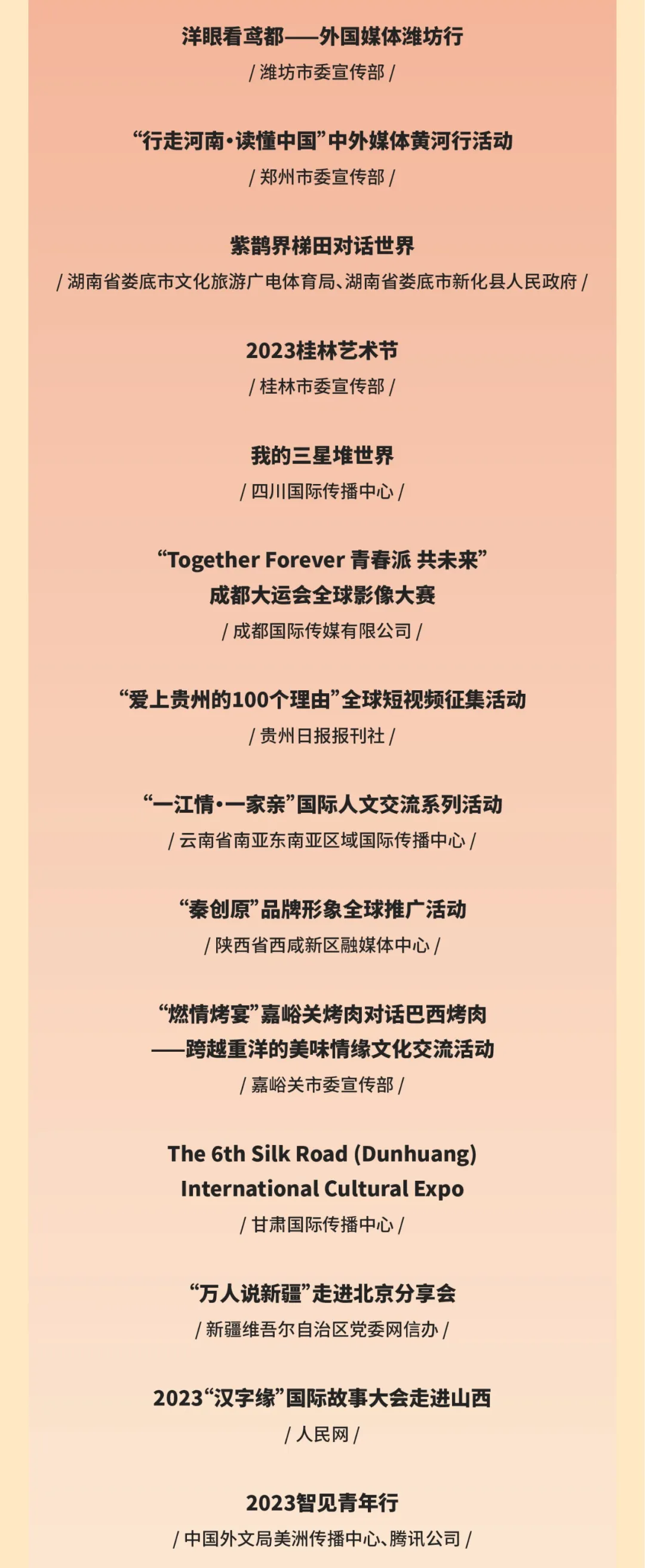 “中国好故事”地域特色文化网络国际传播案例征集展播活动于2023年11月9日在世界互联网大会乌镇峰会“网络传播与文明互鉴”论坛上正式启动,11月9日至12月31日面向全社会公开征集具有地域特色的文化网络国际传播作品,共征集到图文类、活动类、影视类案例作品1400余部。经由高校智库、中央媒体、国际传播、影视制作等领域共计19位评审专家进行多轮评审,最终评选出100部精品案例。