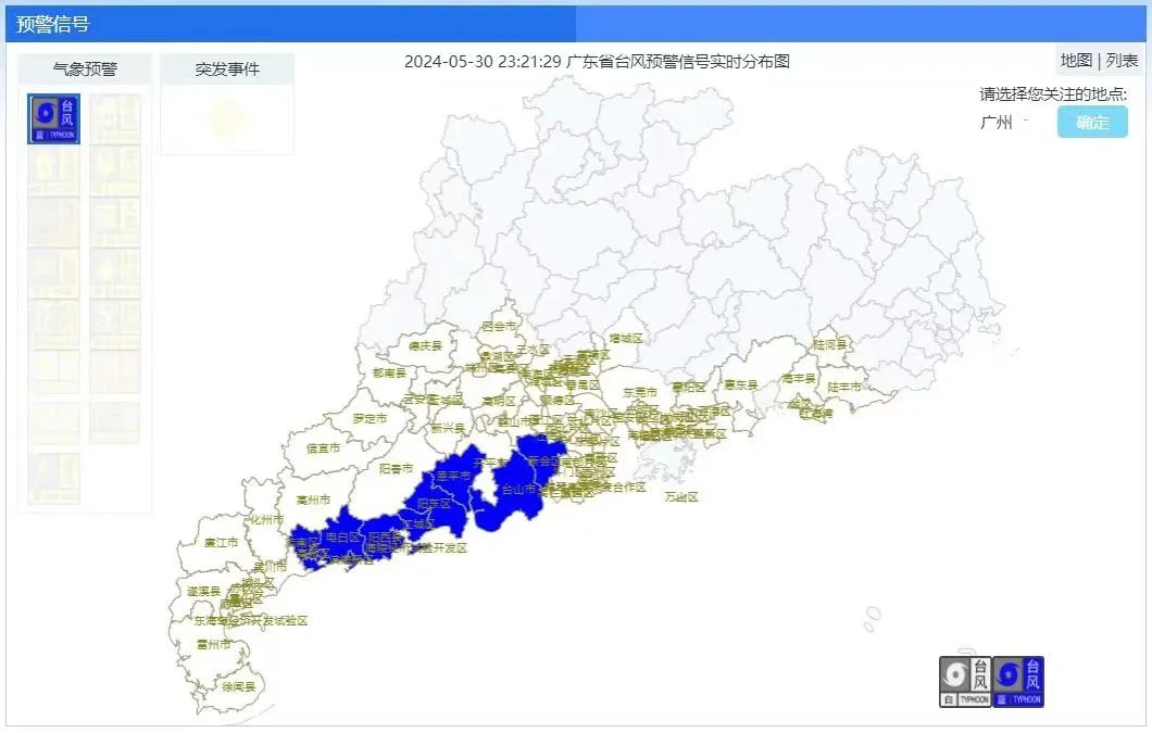 截至5月30日23时21分,茂名电白区、茂南区,阳江阳西县、阳东区,江门恩平市、台山市等多地发布台风蓝色预警信号。随着低压或后期加强系统的进一步移近和增强,不排除广东其他地方继续发布或升级预警信号。