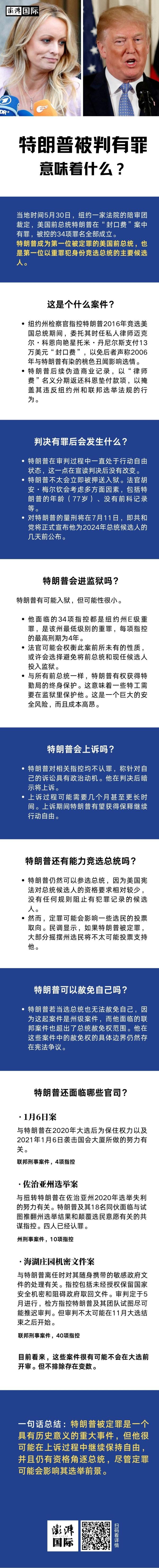 由12名陪审员组成的陪审团在经过两天多的讨论后裁定,特朗普在“封口费”案中被控的34项罪名全部成立。另外,对特朗普的量刑将在7月11日、也就是共和党人将正式宣布他为2024年共和党总统候选人的几天前公布。