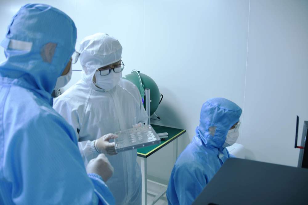 5月29日,在华引芯(武汉)科技有限公司研发中心,孙雷蒙(中)正在指导Mini LED光源可靠性测试。(受访者供图)