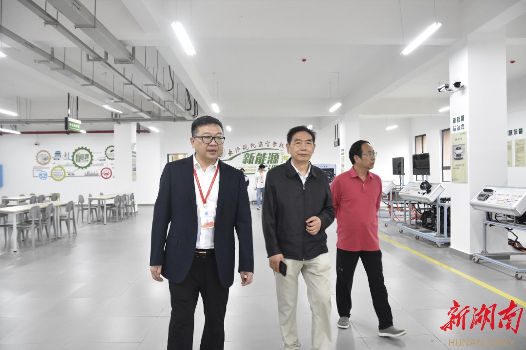签约仪式后,湘师产业教育研究院一行先后走访了学校的航空服务实训室、城市轨道交通实训中心、无人机专业实训室、新能源汽车实训室、国防教育展示室、学术报告厅等场地。