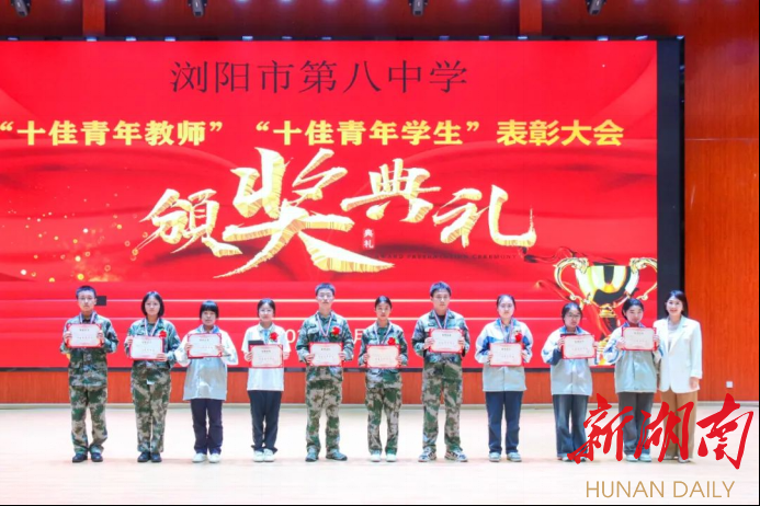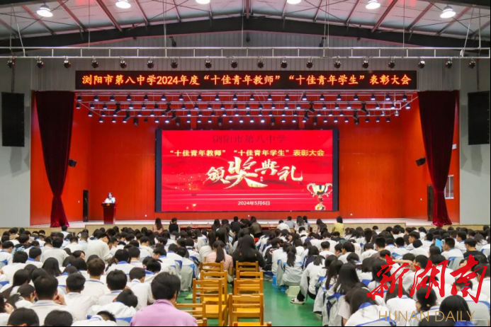 新湖南客户端5月7日讯(通讯员 胡岚慧 邱宇)5月6日晚上七点,浏阳市第八中学风雨篮球场上气氛热烈,掌声雷动,浏阳八中2024年度“十佳青年教师”“十佳青年学生”表彰大会如约而至,浏阳市教育局党建科科长龙莹、团委书记毛佳琦,学校党总支书记高余良、校长赵光再、副校长吴枚保、副校长邓鹏、副校长寻莉、工会主席龙智弟及八中青年教师、学生与获奖的师生共同分享荣耀与喜悦,诉说责任和担当。