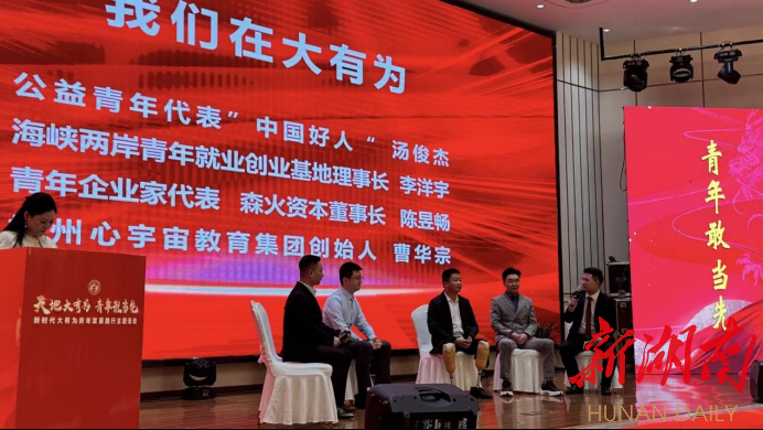 四位新时代大有为青年代表,"中国好人"汤俊杰,海峡两岸青年就业创业基地理事长李洋宇,青年企业家代表、森火资本董事长陈昱畅,杭州心宇宙教育集团创始人曹华宗参与《对话新青年》,讲述自己的不一样的青春,正在践行的大有为行动。