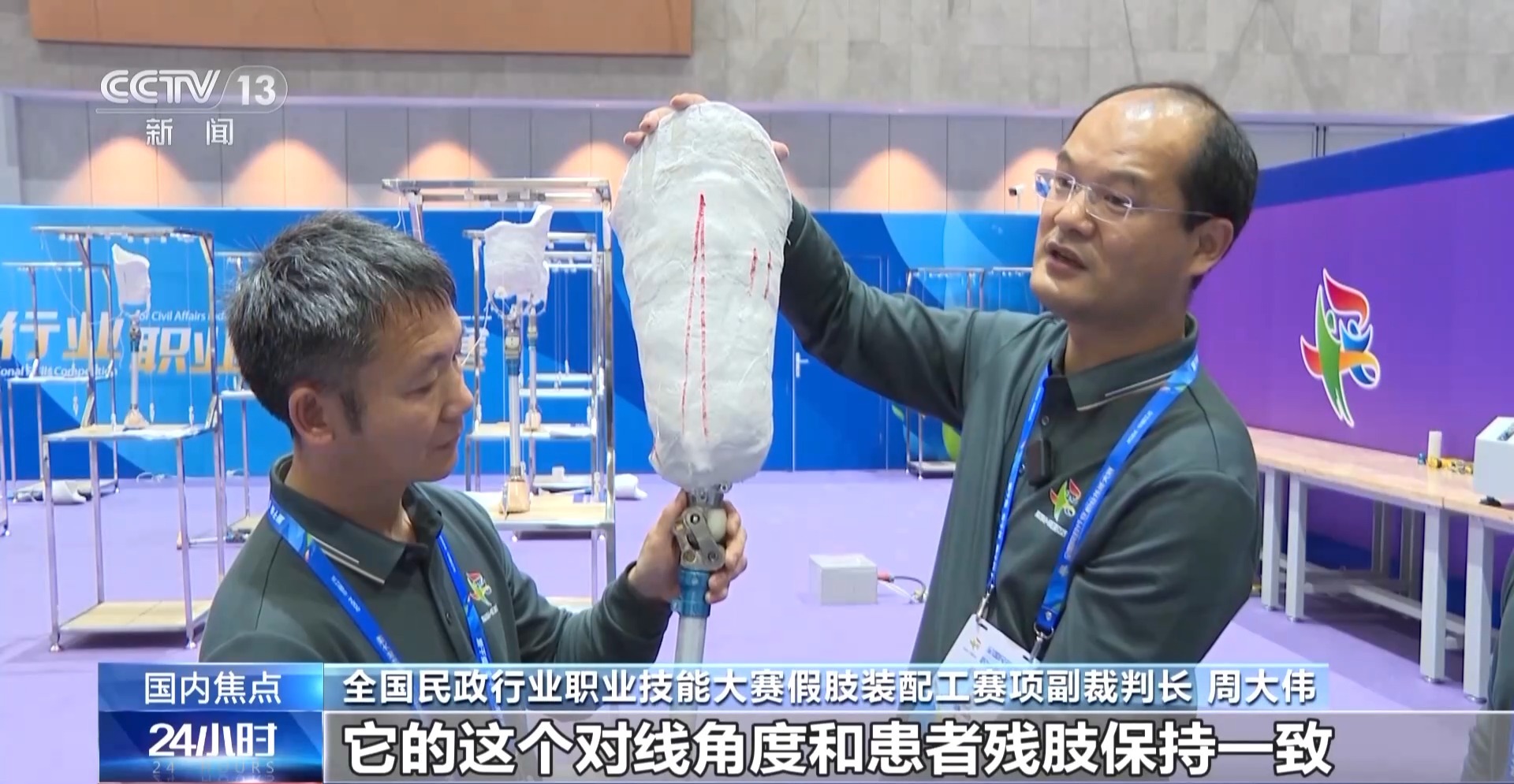 全国民政行业职业技能大赛假肢装配工赛项副裁判长 周大伟:它的对线角度和患者残肢保持一致,并且还符合标准的生物力学对线规则,对于一个熟悉的技师来说,偏差大概在5毫米左右。