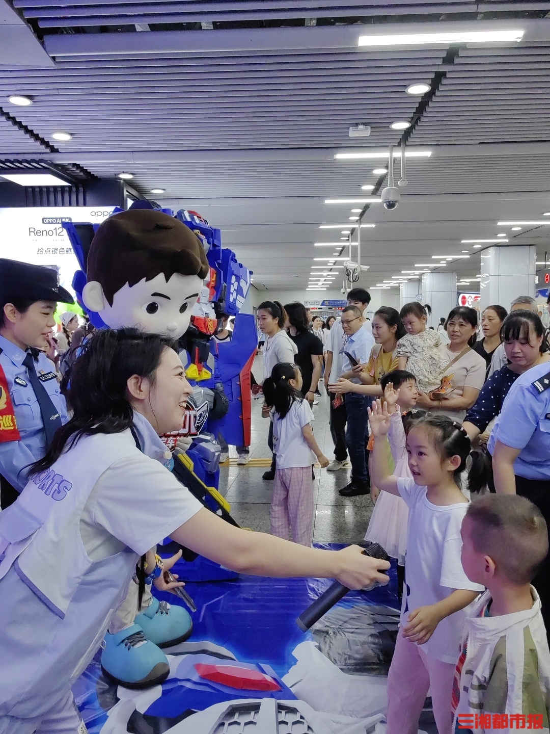 活动现场,民警姐姐、地铁站务姐姐以及承办单位广东易腾动漫文化有限公司主持人COCO等几位主持人,通过生动有趣的讲解和互动游戏、有奖问答等方式,向孩子们传播讲授轨道交通安全等方面的知识,活动现场还准备了500份“咖宝车神地铁卫士”拼装玩具作为奖品,孩子们积极参与,踊跃回答问题,与大型玩偶互动拍照,现场气氛热烈。