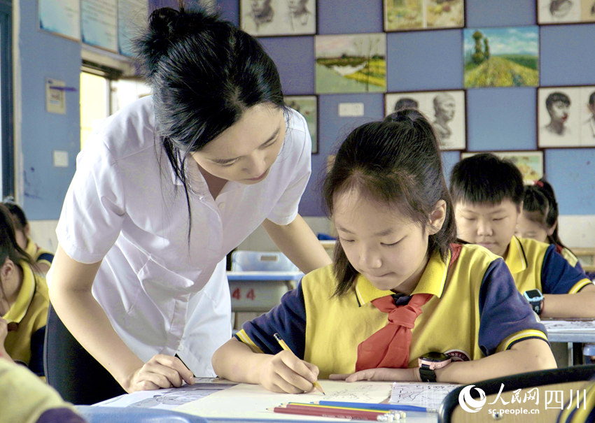 5月31日,南充市嘉陵区之江小学,学生在老师指导下学习绘画。人民网 赵祖乐摄