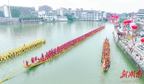 双桡龙舟由两层人划桨,坐着划的叫坐桡,站着划的叫站桡,故称“双桡”,它是兰溪镇特有的民俗文化,是当地为纪念屈原而形成的民间体育运动。作为省级非物质文化遗产和中华体育文化优秀节庆项目,去年,赫山区举办首届兰溪双桡龙舟表演赛,在国内外火爆出圈。今年端午节,该区将举办第二届兰溪双桡龙舟表演赛,届时将有30条双桡龙舟在兰溪河竞演,还有万人同唱“龙船调”、兰溪山歌表演、祭祀等活动。
