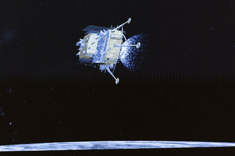 这是6月2日在北京航天飞行控制中心屏幕上拍摄的嫦娥六号着陆器和上升器组合体着陆月背的模拟动画画面。