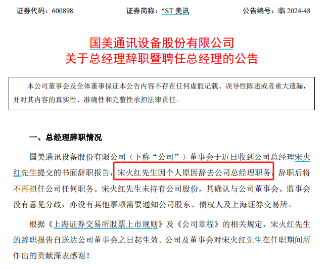 同时,*ST美讯总经理宋火红也因个人原因辞去总经理职务,辞职后不再担任公司任何职务。