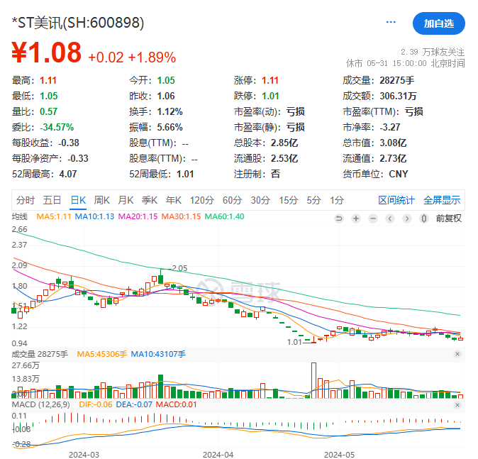 截至5月31日收盘,*ST美讯股价为1.08元/股,当日涨幅为1.89%;总市值仅3亿元。