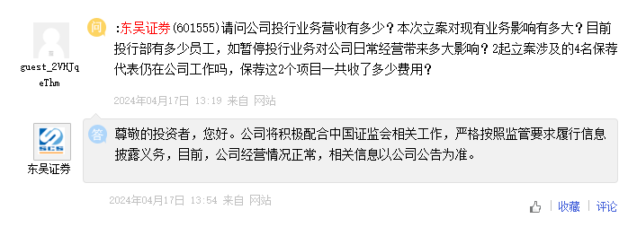 对此,有投资者向东吴证券提出“公司投行业务营收有多少?本次立案对现有业务影响有多大?”等问题。东吴证券则表示,目前公司经营情况正常,相关信息以公司公告为准。