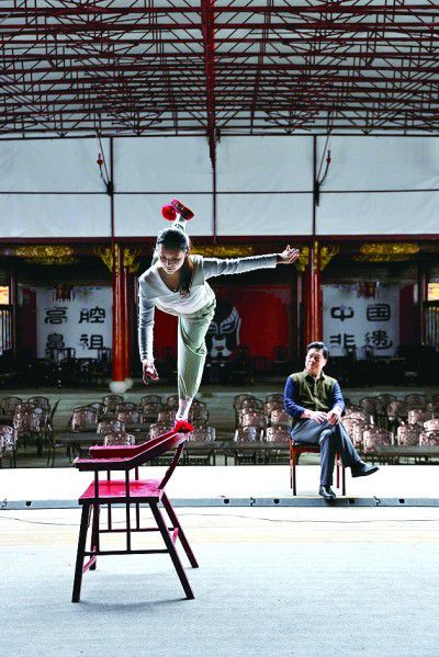 “用热爱写下自己的无悔青春!”这是演员吴平爱写给自己的话。隔天下午,记者在弋阳腔艺术保护中心的舞台一角,结识了“95后”演员吴平爱。不到半平方米的雕花椅,约有七八十厘米高,六厘米宽的座椅靠背支点,只见吴平爱单脚点踩,双臂舒展,另一只腿向后伸展超过120度,整个身体定格在空中。做了几个动作后,她将抬高的腿缓缓地稳落在高椅靠背,双腿在靠背上反复行走,做出灵巧姿态。这半平方米的高椅,仿佛化为几百平方米的舞台。这是吴平爱正在排练作品《挂画》,这样的排练,她坚持了十几年。“排练很苦,唯有热爱不会辜负坚持,看到更多的人喜爱弋阳腔,自己也有了更大的动力。”吴平爱向记者感叹。