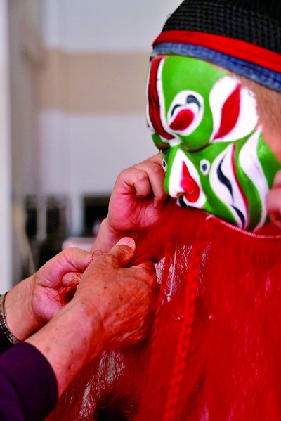 台上的演员张凯峰,是1993年出生的帅气小伙,从14岁开始学戏到今天,已经参加过3000多场大大小小演出。这次的下乡,已是他今年参加的第153次下乡演出。“我们每年要演六个多月,一天最少两场,有时候还要三四场,每一次演出都是一次自我考核,舞台有大小,观众有多少,但我们都用同样的标准要求自己。”演出间隙,张凯峰对记者说,“无论何时,只要华服在身,就要把最好的状态和作品呈现给观众。”
