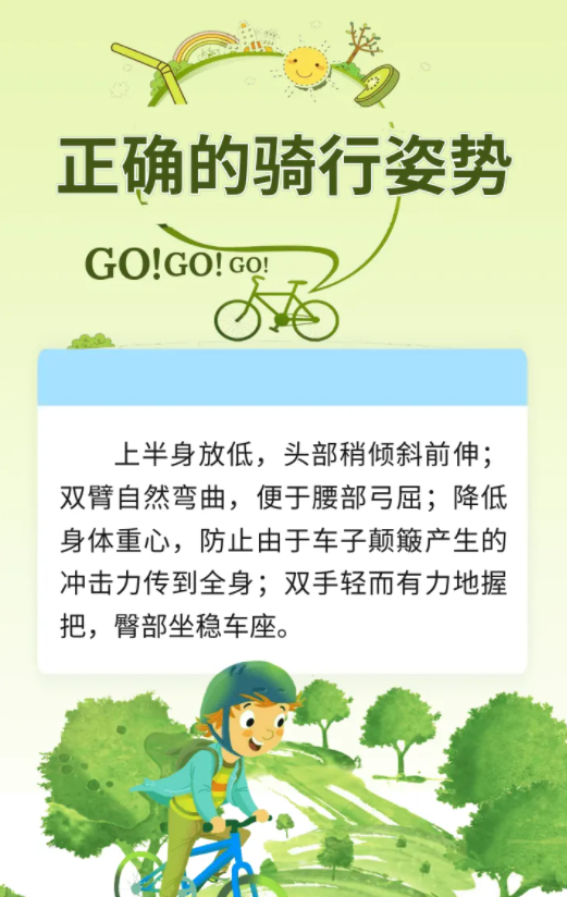 因此,骑行者要注意保持正确的骑车姿势。当骑车时间较长时,要注意变换骑车姿势,并适当休息。