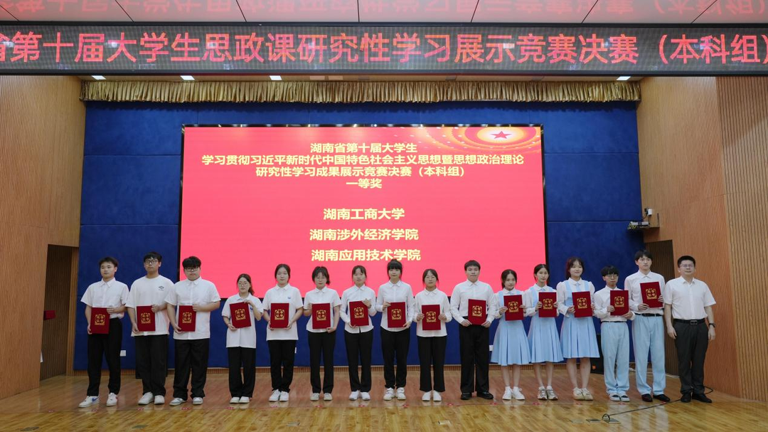 6月1日,湖南省第十届大学生学习贯彻习近平新时代中国特色社会主义思想暨思想政治理论课研究性学习成果展示(本科组)竞赛决赛在湖南工业大学举行,经激烈角逐,最终,湖南涉外经济学院选送的作品《习近平文化思想视域下文旅融合的实践路径探究——以长沙市为例》斩获本科组一等奖。