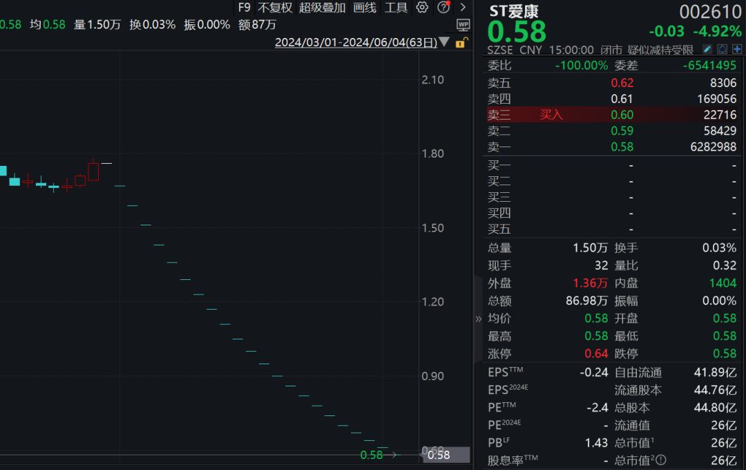 6月4日,ST爱康录得2023年年报及2024年一季报披露后的连续第22个跌停,这也是公司股价跌破1元/股后的第11个跌停板。当日,公司股价收于0.58元/股。