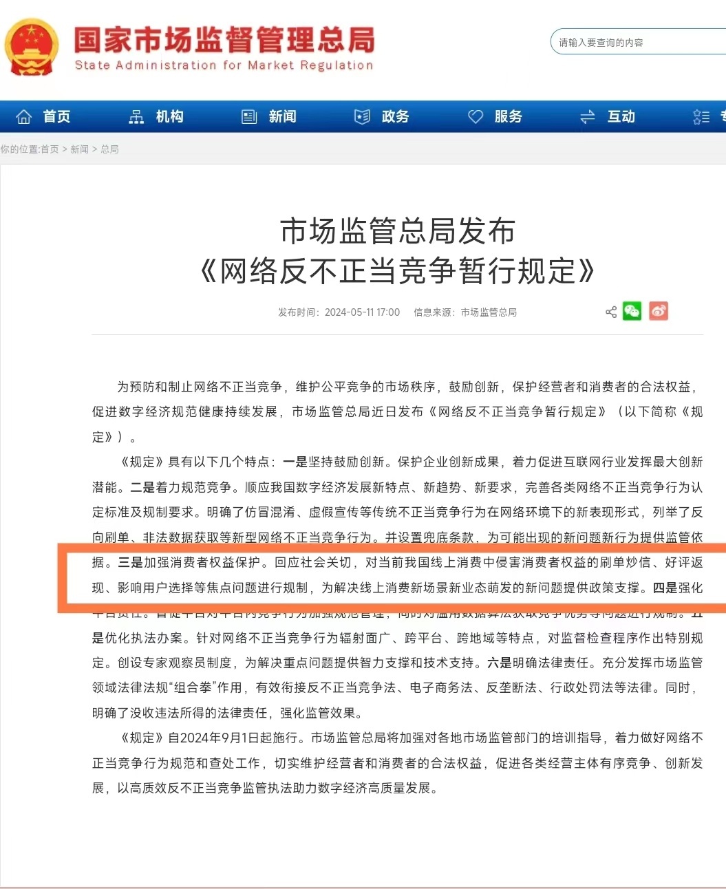 近日,市场监管总局发布《网络反不正当竞争暂行规定》,要求经营者不得编造用户评价,不得以返现、红包、卡券等方式利诱用户作出指定好评、点赞、定向投票等互动行为。