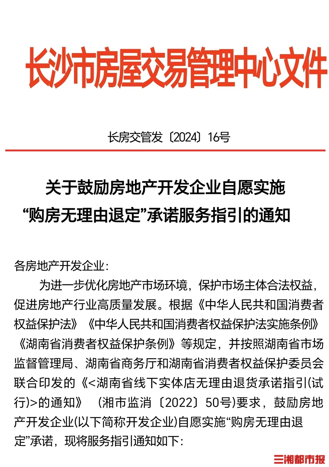 三湘都市报·新湖南客户端6月5日讯(全媒体记者卜岚 通讯员 胡姗姗)今日,记者从长沙市房屋交易管理中心获悉,该中心于近日发布了《关于鼓励房地产开发企业自愿实施“购房无理由退定”承诺服务指引的通知》(以下简称《通知》)。《通知》明确鼓励开发企业自愿实施“购房无理由退定”承诺,开发商需在销售现场公示无理由退定协议,并在收到退定申请后七个工作日内退还定金。