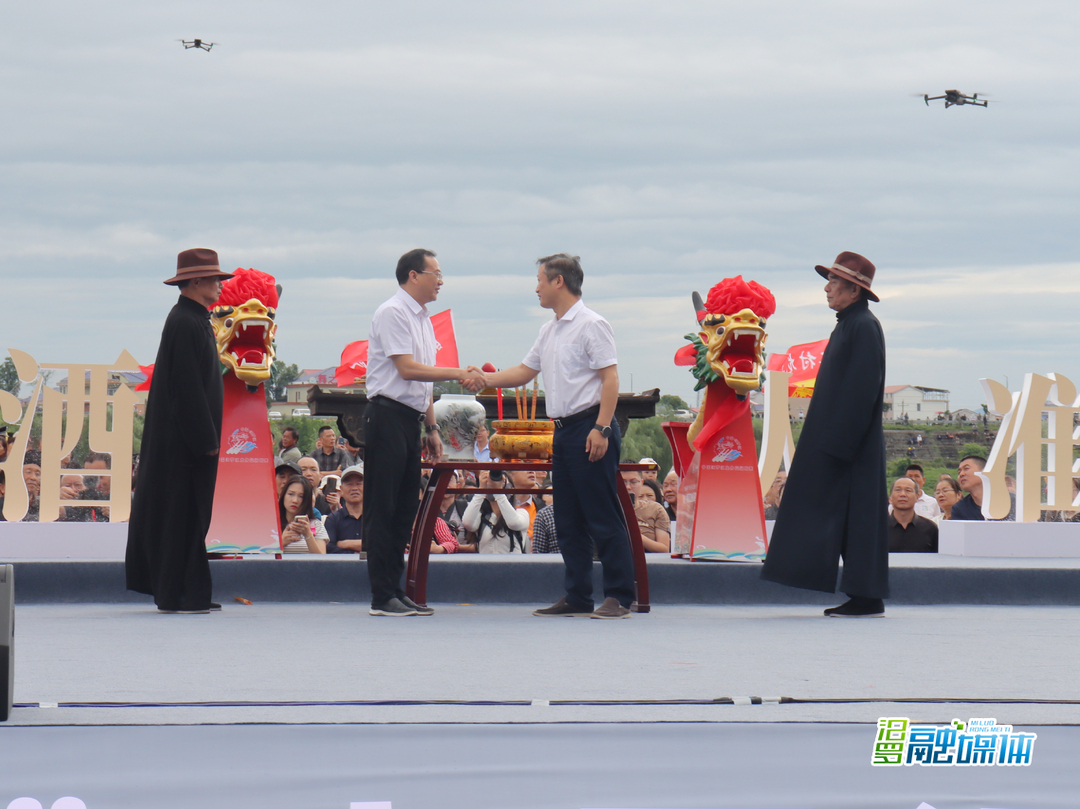 汨罗市委常委、宣传部部长艾志军,醴陵市委常委、宣传部部长欧阳建斌交换汨罗&醴陵旅游友好城市合作文本,并互赠代表着城市形象的千年乌木龙舟和釉下五彩扁豆双禽瓶。