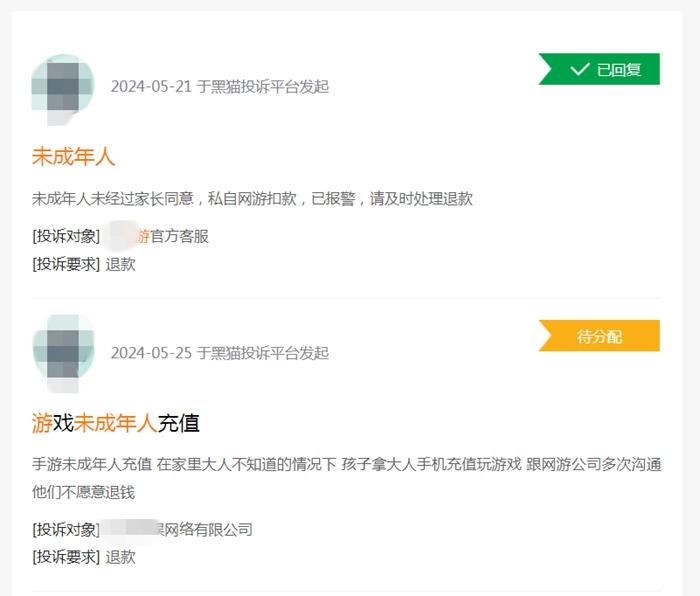 在黑猫投诉平台上,有大量相关投诉显示,都是孩子在大人不知情的情况下,产生的网游充值消费,然后遭遇退款难的问题。