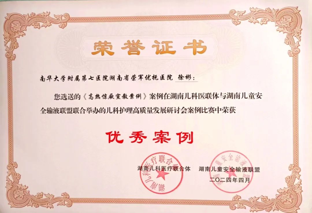 为促进儿科优质医疗资源下沉,构建省内优质高效的儿科医疗服务体系,由湖南省医院协会、湖南省儿科医联体主办,国家区域儿童医学中心湖南省儿童医院承办,湖南儿科高质量发展论坛暨2024年湖南省儿科医联体工作会议在长沙召开。南华附七医院 省荣军优抚医院护理部报送的案例《改善针头恐惧症患儿的输液穿刺体验》从全国120余家三甲、二甲联盟单位报送的案例中脱颖而出晋级前12名进入决赛。经过激烈的现场决赛角逐,该案例荣获湖南儿科医疗联合体“二等奖”;儿科护理团队报送的《高热惊厥宣教案例》荣获湖南儿科医疗联合体“优秀案例”奖。同时,《改善针头恐惧症患儿的输液穿刺体验》还荣获了湖南省医院协会“优秀案例”奖。