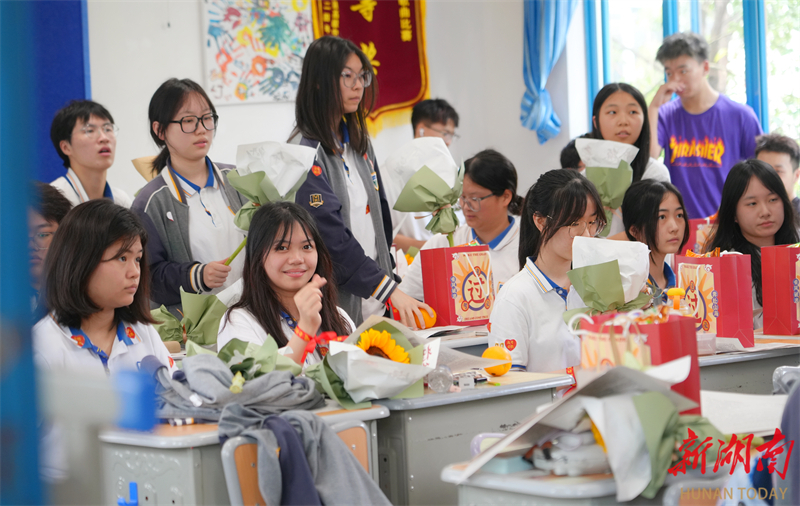 在G2108班,教室门框上挂着一个写满了祝福语的大粽子,进门的学子轻轻跳起,用头顶触粽子,开心地喊着:“一定高中(粽)!”顶完“高粽”,越过龙门,每位同学都收到了班主任亲手赠送的向日葵和祝福:“希望同学们都能像这向日葵一样,充满阳光和活力,同时也祝愿你们一举夺‘葵’,金榜题名!”