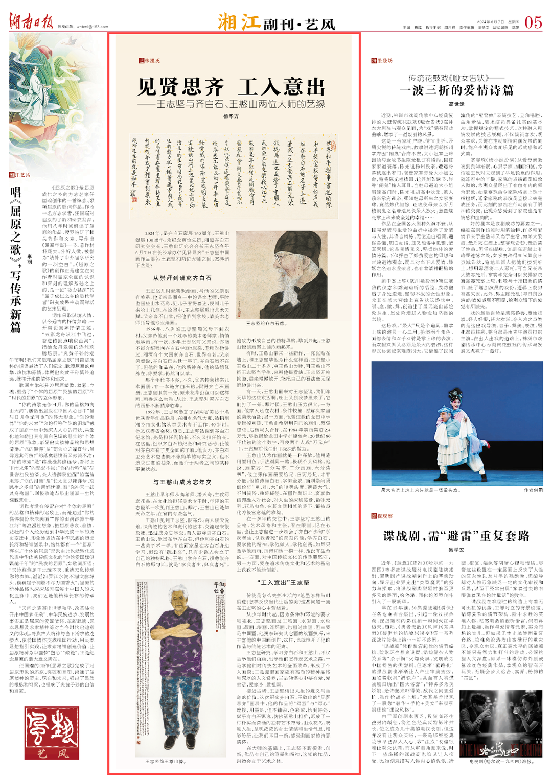 2024年,是齐白石诞辰160周年,王憨山诞辰100周年。为纪念两位先贤,湘潭齐白石研究会会长、王憨山研究会会长王志坚今年6月7日在长沙举办《“见贤思齐”王志坚中国画作品展》。王志坚和两位大师之间,怎样结下艺缘?
