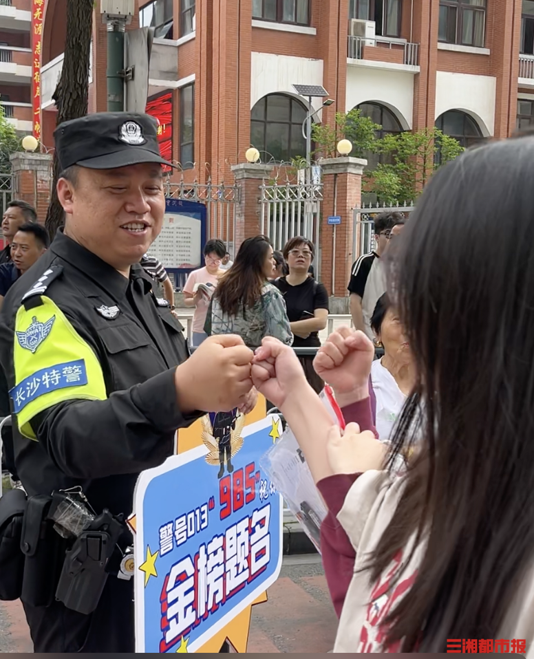三湘都市报6月7日(全媒体记者 杨洁规 通讯员谭怡里 邓孟军)6月7日,2024年全国高考首日。一大早,警号“013985”的长沙公安岳麓特巡警大队副大队长梅贵生在长郡梅溪湖中学护考,手持应援加油牌为考生们加油打气,考生、家长们纷纷上前与他合影、握手。