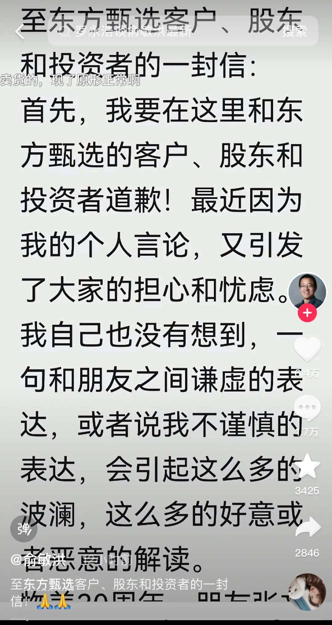 导读:俞敏洪称,此前言论不意味着自己对东方甄选的经营不再负责任。