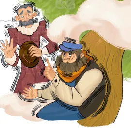 商人吃完饭后对他俩说:“我这里有 8 个银币,请你们收下。”说着把银币放到了吃饭的毯子上,又忙着赶路了。
