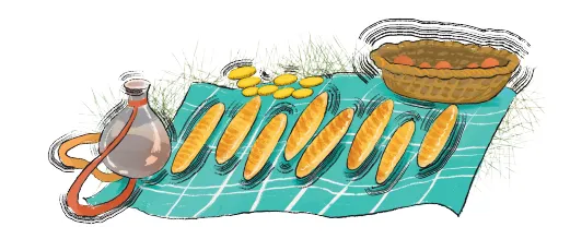 两个人正津津有味地吃着,有个商人路过这里,鞠躬对他俩说:“先生们好!我也是赶路的,带的食物吃光了。我想与两位先生共进午餐,你们不会拒绝吧?我会付给你们钱的。”