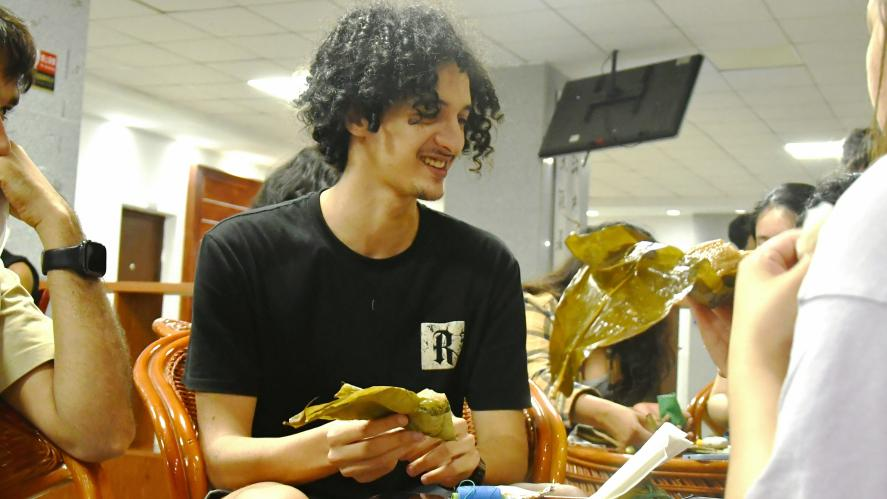 穿针、引线、填补香料……中外学生还一同手工制作端午香囊,互相赠送美好祝福。互帮互助,交流合作,汉语角充满了欢声笑语,也充分展现出中华优秀传统文化的独特魅力和强大聚合力。在知识竞答环节,美味的粽子作为奖励,引得中外学子纷纷举手踊跃答题,现场气氛热烈融洽。