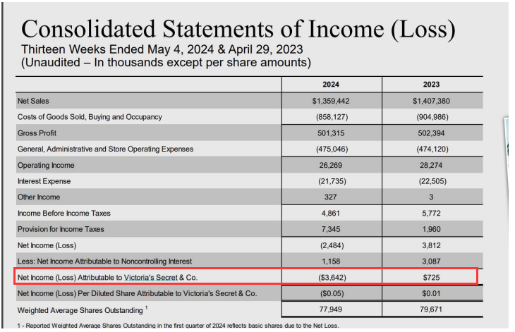据近日维密公布的2024财年第一季度财报,截至2024年5月4日的13周内,该公司归母净利润为-364.2万美元(约合人民币-2638万元),较2023年同期的72.5万美元大幅下滑。维密预计,2024年净销售额将较2023年有所下降。