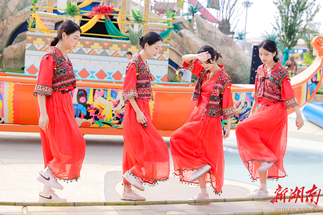 开幕仪式当天随着欢快的音乐和热情洋溢的舞蹈,衡阳玛雅海滩正式向公众敞开了大门。身着传统服饰的傣妹手持银碗,在入园闸口处洒下祝福的水花,仿佛将每一位游客都带入了一个清凉的世界。而定点的竹竿舞表演,则以少数民族独特的庆祝形式,为每位游客展示了浓厚的文化底蕴,增添了一份独特的文化体验。