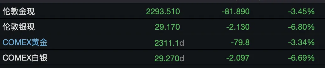 当地时间6月7日(周五),黄金价格遭遇重挫。伦敦金现、伦敦银现分别收跌3.45%、6.8%。其中,现货黄金价格一度跌破2290美元关口。COMEX黄金期货主力合约收跌3.34%,创2022年4月22日以来主力合约最大收盘跌幅,报2311.1美元/盎司,刷新5月8日以来收盘低位。COMEX白银期货主力合约收跌6.69%,报29.27美元/盎司。