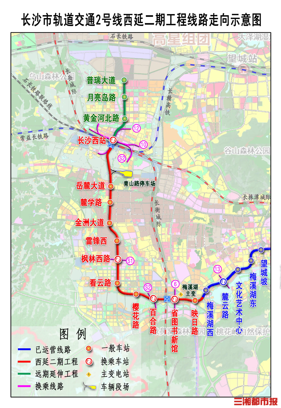 长沙地铁2号线西延二期工程起于长沙西站,沿汇智路往南引入梅溪湖核心片区,再沿梅溪湖中轴线往东穿越西三环,止于2号线西延一期工程起点站梅溪湖西站(不含)。线路全长13.82公里,设车站11座,均为地下站。新建青山路停车场1座,与6号线共享梅溪湖主变,利用既有杜花路控制中心。